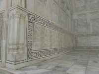 Mausoleet, som ligger på en hög sockel, byggdes 1632-47 i persisk stil och är omgivet av fyra smala minareter. Det är utfört i skinande vit marmor och dekorerat med miljontals halvädelstenar. Hela byggnaden utstrålar ro och harmoni och är mycket vackert där det ligger vid stranden av en flod.